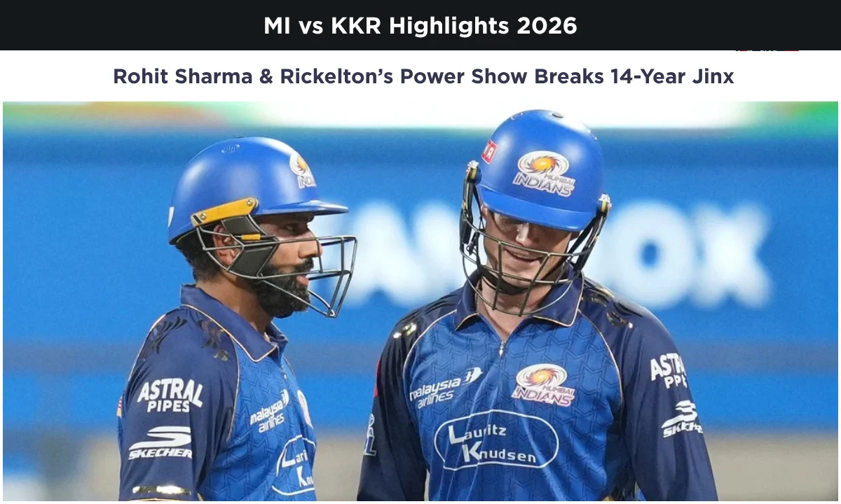 MI vs KKR Highlights 2026: Rohit Sharma & Rickeltonβs Power Show Breaks 14-Year Jinx