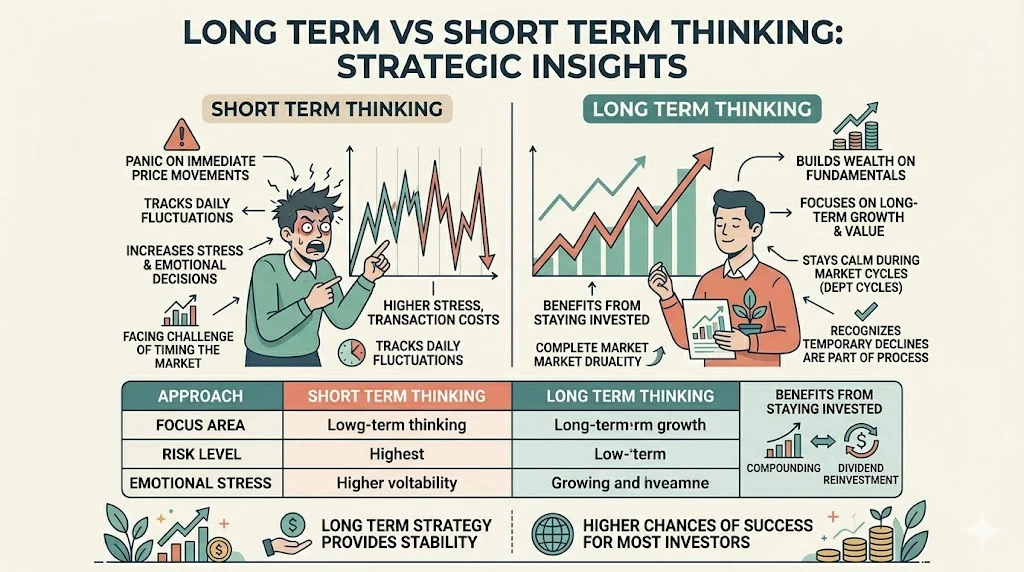 Short term thinking often leads to panic because it focuses on immediate price movements. When investors track daily fluctuations, even small declines can feel significant. This creates stress and increases the likelihood of emotional decisions.