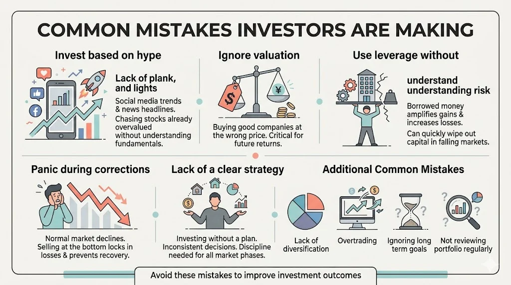 They ignore valuation. Buying a good company at the wrong price can lead to losses. Valuation plays a critical role in determining future returns. They use leverage without understanding risk. Borrowed money can amplify gains but also increases losses. In falling markets, leverage can quickly wipe out capital.