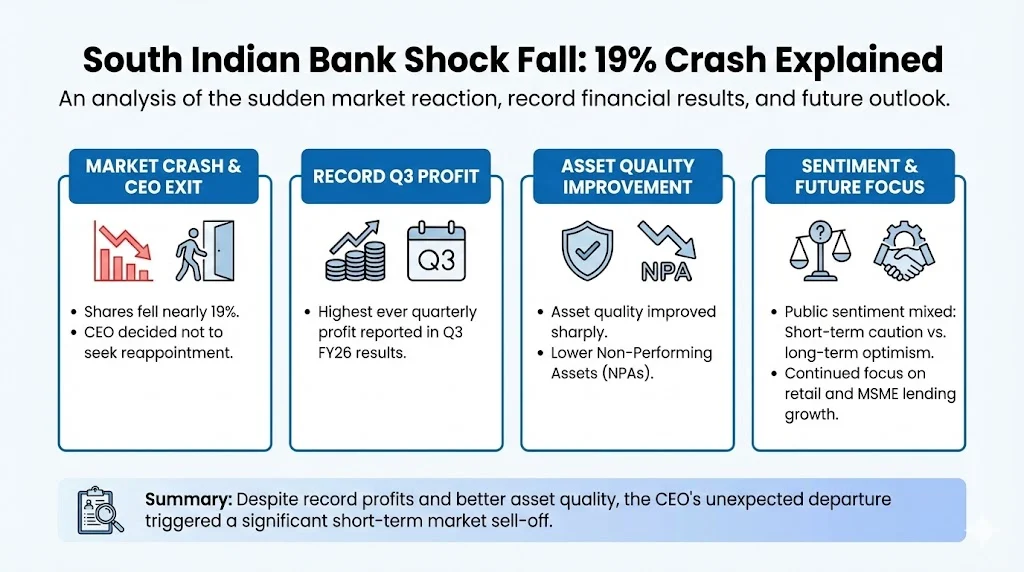 South Indian Bank’s sharp fall on January 30, 2026, was driven mainly by the announcement of the CEO stepping down after his term. This news overshadowed strong Q3 results and improvements in asset quality.