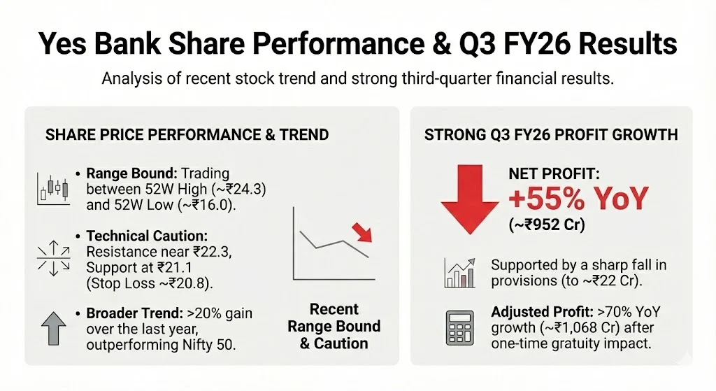 The share price of Yes Bank Ltd has remained largely range bound in recent weeks. The stock is currently trading below its 52 week high of around ₹24.3 and well above the 52 week low near ₹16.0. This movement suggests that the market is digesting recent earnings without taking aggressive directional bets.