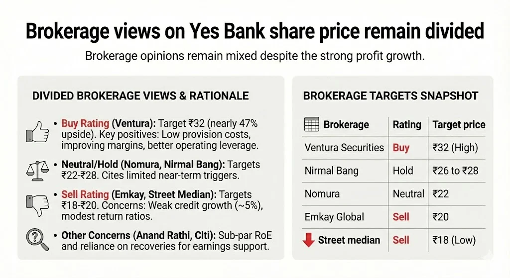 Brokerage opinions on Yes Bank remain mixed despite the strong profit growth. Some firms see meaningful upside, while others remain cautious on growth sustainability and valuation comfort.